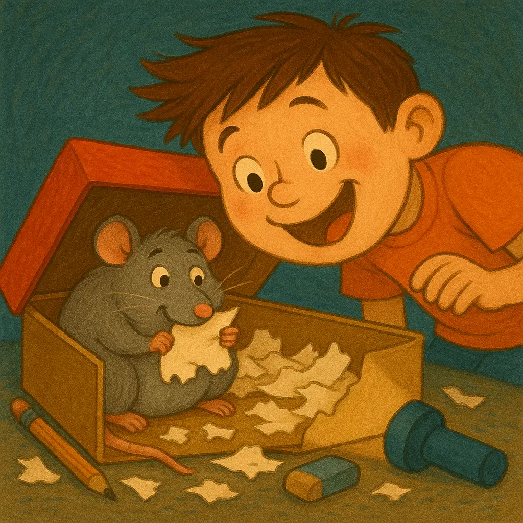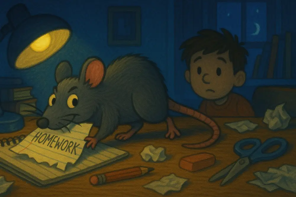 He peeked under his desk… and gasped. A plump gray rat was stuffing his homework into a shoebox, nibbling on the corners like potato chips!