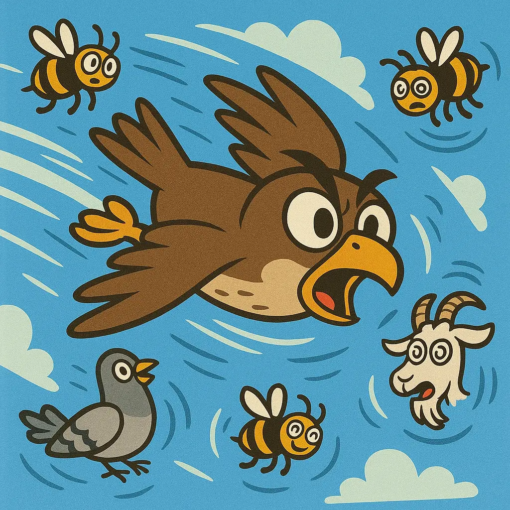 He zipped past bees who yelled, “Hey, feather blur, slow down!”